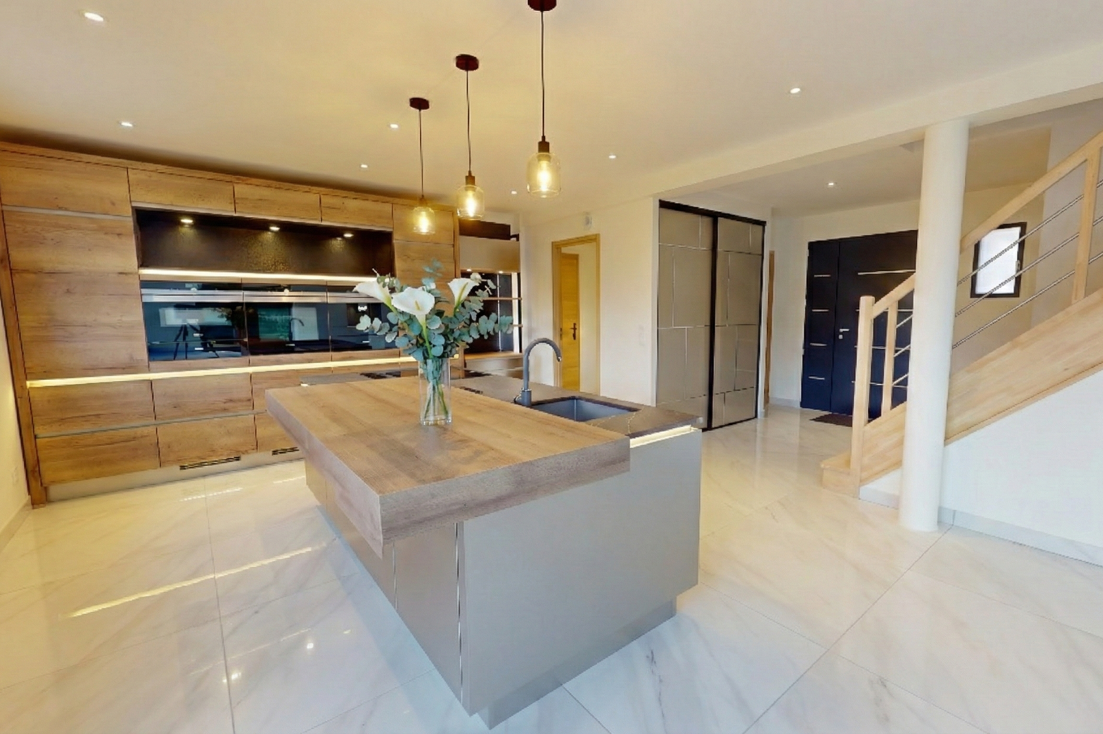 La cuisine, véritable pièce de vie à elle seule, séduit par son travertin au sol, ses équipements haut de gamme, et ses matériaux nobles choisis avec goût.